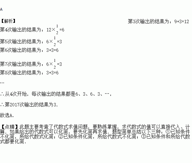 如图所示的运算程序中,若开始输入的x值为15,则第1次输出的结果为18,第2次输出的结果为9,···,第2017次输出的结果为( )