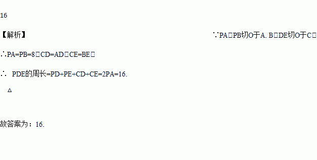 如图:PA、PB切⊙O于A、B,过点C的切线交PA、PB于D、E,PA=8,则⊿PDE的周长为____________.