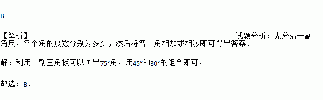 B 【解析】试题分析:先分清一副三角尺,各个角的度数分别为多少,然后将各个角相加或相减即可得出答案. 【解析】 利用一副三角板可以画出75°角,用45°和30°的组合即可, 故选:B.