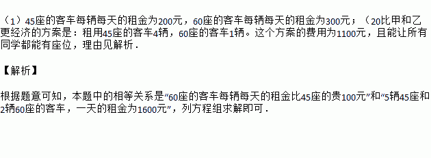 (1)两同学向公司经理了解租车的价格,公司经理对他们说:“公司有45座和60座两种型号的客车可供租用,60座的客车每辆每天的租金比45座的贵100元.”王老师说:“我们学校八年级昨天在这个公司租了5辆45座和2辆60座的客车,一天的租金为1600元,你们能知道45座和60座的客车每辆每天的租金各是多少元吗”甲、乙两同学想了一下,都说知道了价格.