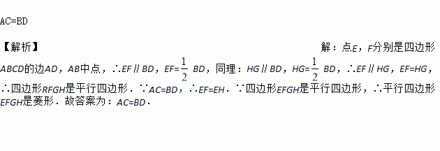 在四边形ABCD中,E、F、G、H分别是边AD、AB、CB、DC的中点,当四边形ABCD满足条件________时所得的四边形EFGH是菱形.