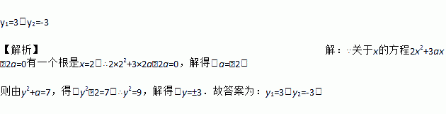 y1=3,y2=-3 【解析】【解析】 ∵关于x的方程2x2+3ax﹣2a=0有一个根是x=2,∴2×22+3×2a﹣2a=0,解得:a=﹣2. 则由y2+a=7,得:y2﹣2=7,∴y2=9,解得:y=±3.故答案为:y1=3,y2=-3.