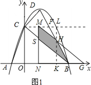 情况一:如图1,当0<t≤$\frac{3}{2}$时,设△COB平移到△GNM的位置,MG交BD于点H,MN交BC于点S![]()