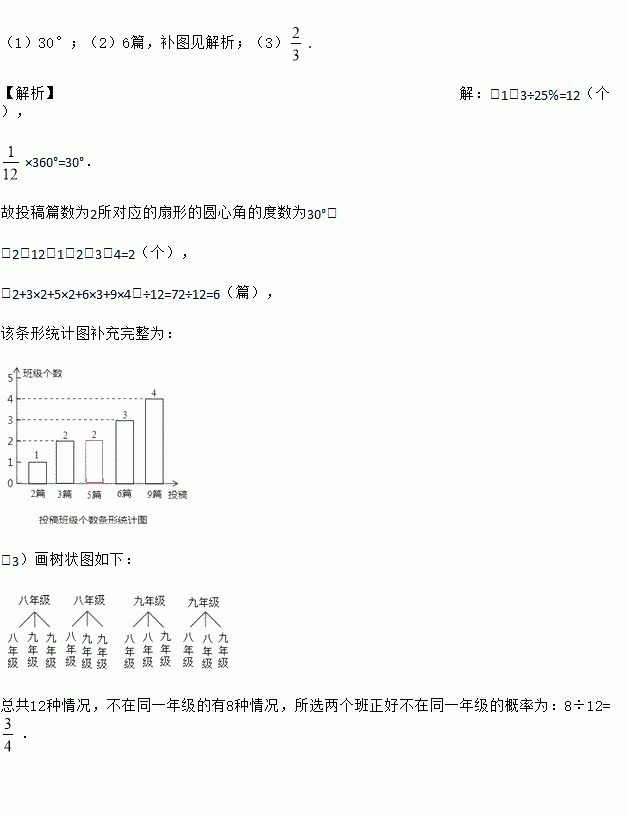 (3)在投稿篇数为9篇的4个班级中,八,九年级各有两个班,校学生会准备从这四个中选出两个班参加全市的表彰会,请你用列表法或画树状图的方法求出所选两个班正好不在同一年级的概率.