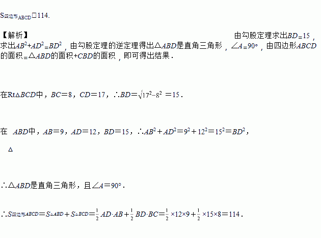 如图,在四边形ABCD中,∠DBC=90°,AB=9,AD=12,BC=8,DC=17,求四边形ABCD的面积.