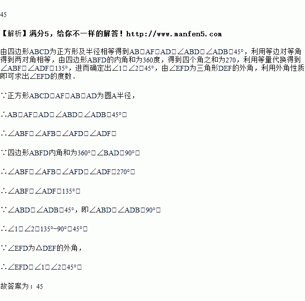 如图,点E是正方形ABCD的边CD上一点,以A为圆心,AB为半径的弧与BE交于点F,则∠EFD=_____°.
