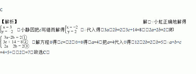 在解关于x,y的方程组时,小虹正确地解得,小静因把c写错而解得,那么a+b+c的值为( )