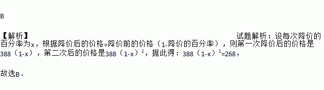 B 【解析】试题解析:设每次降价的百分率为x,根据降价后的价格=降价前的价格(1-降价的百分率),则第一次降价后的价格是388(1-x),第二次后的价格是388(1-x)2,据此得:388(1-x)2=268, 故选B.