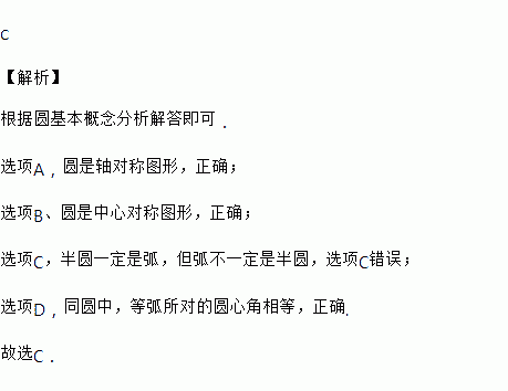 A. 圆是轴对称图形 B. 圆是中心对称图形 C. 半圆不是弧 D. 同圆中,等弧所对的圆心角相等