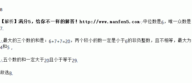 五名学生投篮球,规定每人投20次,统计他们每人投中的次数,得到五个数据.若这五个数据的中位数是6,唯一众数是7,则他们投中次数的总和可能是( )