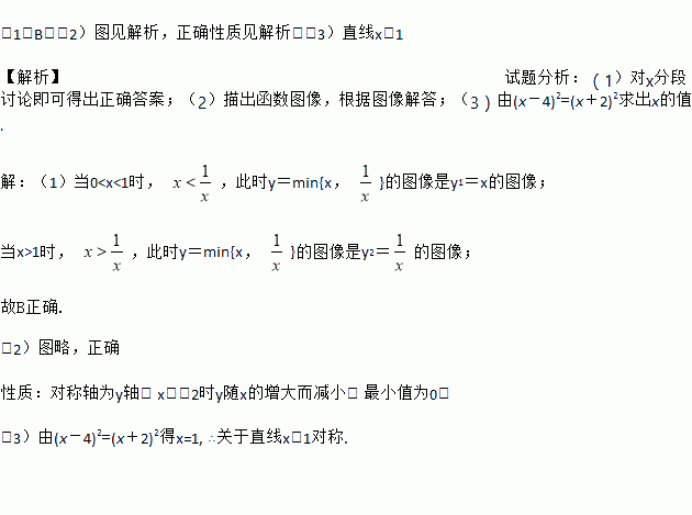 (1)B;(2)图见解析,正确性质见解析;(3)直线x=1 【解析】试题分析:(1)对x分段讨论即可得出正确答案;(2)描出函数图像,根据图像解答;(3)由(x-4)2=(x+2)2求出x的值. 【解析】 (1)当0