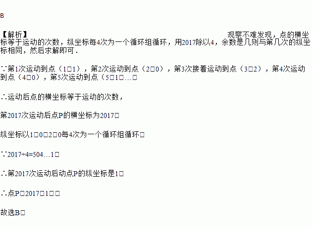 如图,动点P在平面直角坐标系中按图中箭头所示方向运动,第1次从原点运动到点(1,1),第2次接着运动到点(2,0),第3次接着运动到点(3,2),…,按这样的运动规律,经过第2017次运动后,动点P的坐标是( )