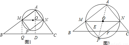 £¨2£©µ±Ô²OÓëBCÏàÇÐʱ£¬Oµ½BCµÄ¾àÀë¾ÍÊÇMNµÄÒ»°ë£¬ÄÇô¹Ø¼üÊÇÇó³öMNµÄ±í´ïʽ£¬¿É¸ù¾ÝÈý½ÇÐÎAMNºÍÈý½ÇÐÎABCÏàËÆ£¬µÃ³öMNµÄ±í´ïʽ£¬Ò²¾ÍÇó³öÁËOµ½BCµÄ¾àÀëµÄ±í´ïʽ£¬Èç¹û¹ýM×÷MQ¡ÍBCÓÚQ£¬ÄÇôMQ¾ÍÊÇOµ½BCµÄ¾àÀ룬ȻºóÔÚÖ±½ÇÈý½ÇÐÎBMQÖУ¬ÓáÏBµÄÕýÏÒº¯ÊýÒÔ¼°BMµÄ±í´ïʽ±íʾ³öMQ£¬È»ºóÈÃÕâÁ½±íʾMQµÄº¬xµÄ±í´ïʽÏàµÈ£¬¼´¿ÉÇó³öxµÄÖµ£»