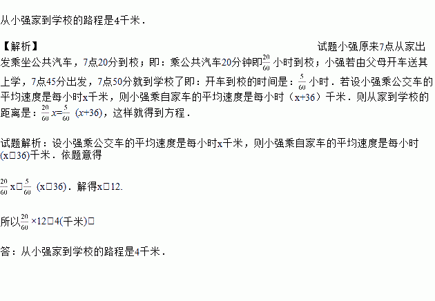 Ϊ±£Ö¤Ñ§ÉúÓÐ×ã¹»µÄ˯Ãߣ¬ÕþÐίԱÓÚ½ñÄêÁ½»áÏò´ó»áÌá³öÒ»¸öÒé°¸£¬¼´¡°ÍƳÙÖÐСѧÉúÔ糿ÉÏ¿Îʱ¼ä¡±£¬Õâ¸öÒé°¸µ±¼´µÃµ½²»ÉÙÈË´ó´ú±íµÄÖ§³Ö£®¸ù¾Ý±±¾©ÊнÌίµÄÒªÇó£¬Ñ§ÉúСǿËùÔÚѧУ½«Ñ§Éúµ½Ð£Ê±¼äÍÆ³Ù°ëСʱ£®Ð¡Ç¿ÔÀ´7µã´Ó¼Ò³ö·¢³Ë×ø¹«¹²Æû³µ£¬7µã20·Öµ½Ð££»ÏÖÔÚСǿÈôÓɸ¸Ä¸¿ª³µËÍÆäÉÏѧ£¬7µã45·Ö³ö·¢£¬7µã50·Ö¾Íµ½Ñ§Ð£ÁË£®ÒÑ֪Сǿ³Ë×Ô¼Ò³µ±È³Ë¹«½»³µÆ½¾ùÿСʱ¿ì36ǧÃ×£¬Çó´ÓСǿ¼Òµ½Ñ§Ð£µÄ·³ÌÊǶàÉÙǧÃ×£®
