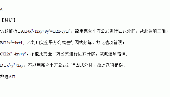 A. 4x2﹣12xy+9y2 B. 2x2+4x+1 C. 2x2+4xy+y2 D. x2﹣y2+2xy
