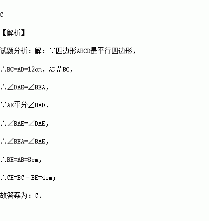 如图,在?ABCD中,已知AD=12cm,AB=8cm,AE平分∠BAD交BC边于点E,则CE的长等于( )