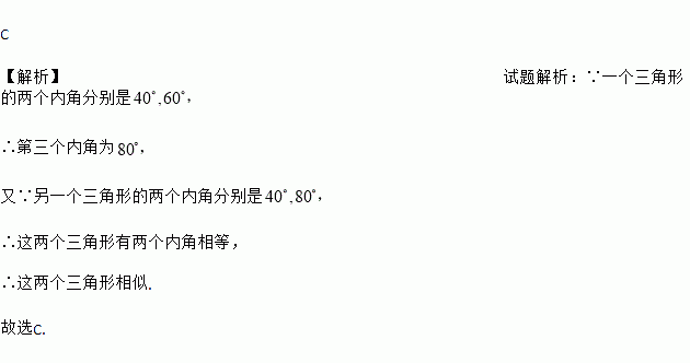 C 【解析】试题解析:∵一个三角形的两个内角分别是 ∴第三个内角为 又∵另一个三角形的两个内角分别是 ∴这两个三角形有两个内角相等, ∴这两个三角形相似. 故选C.