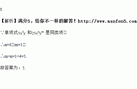 若单项式 5x4y 和 25xnym 是同类项,则 m+n 的值为_____.
