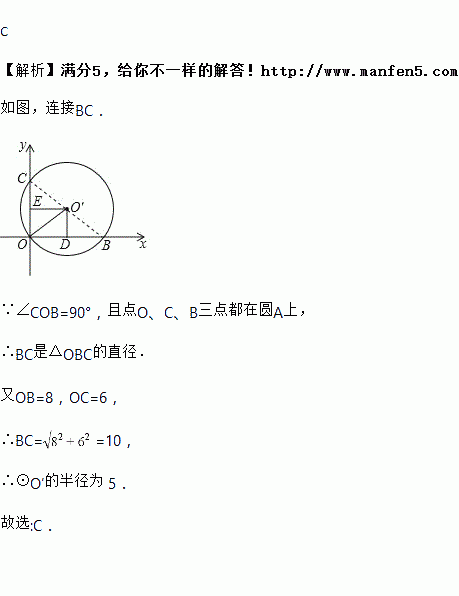 如图,在平面直角坐标系中,⊙O′经过原点O,并且分别与x轴、y轴交于点B、C,分别作O′E⊥OC于点E,O′D⊥OB于点D.若OB=8,OC=6,则⊙O′的半径为( )