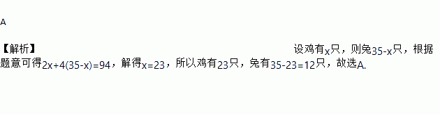 A. 鸡23只,兔12只 B. 鸡12只,兔23只 C. 鸡15只,兔20只 D. 鸡20只,兔15只