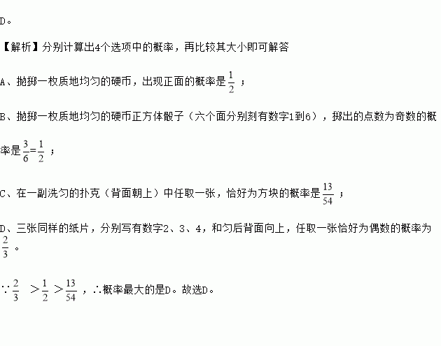 D. 三张同样的纸片,分别写有数字2,3,4,和匀后背面朝上,任取一张恰好为偶数