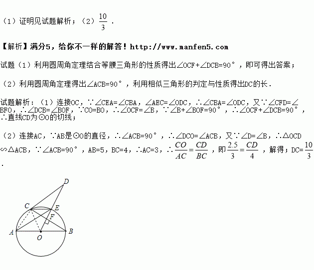 (10分)如图,AB是⊙O的直径,OD⊥弦BC于点F,交⊙O于点E,连结CE、AE、CD,若∠AEC=∠ODC.