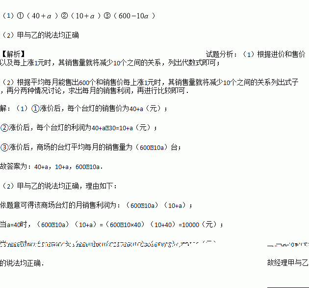 (2)如果商场要想销售利润平均每月达到10000元,商场经理甲说“在原售价每台40元的基础上再上涨40元,可以完成任务”,商场经理乙说“不用涨那么多,在原售价每台40元的基础上再上涨10元就可以了”,试判断经理甲与乙的说法是否正确,并说明理由.