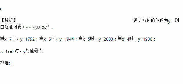 在一张边长为 30 cm 的正方形纸片的四角上分别剪去一个边长为 x cm 的小正方形,然后将剩余部分折叠成一个无盖的长方体.则使得长方体的体积最大的 x 的取值是 ( )