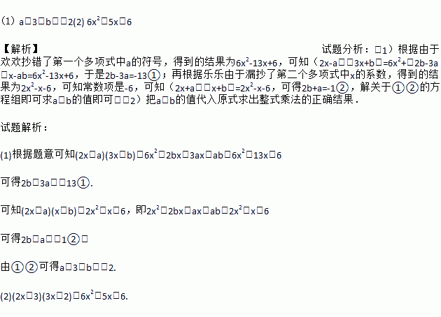欢欢和乐乐两人共同计算一道整式乘法题:(2x+a)(3x+b),由于欢欢抄错了第一个多项式中a的符号,得到的结果为6x2-13x+6,乐乐由于漏抄了第二个多项式中x的系数,得到的结果为2x2-x-6.