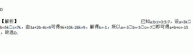 若a:b:c=3:5:7,且3a+2b-4c=9,则a+b+c的值等于( )
