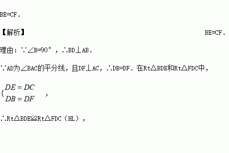 (6分)已知:如图,AD为∠BAC的平分线,且DF⊥AC于F,∠B=90°,DE=DC.试问BE与CF的数量关系,并加以说明.