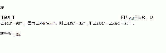 如图,AB是圆O的直径,C、D为圆上的两点,若∠BAC=55°,则∠ADC为__________度.
