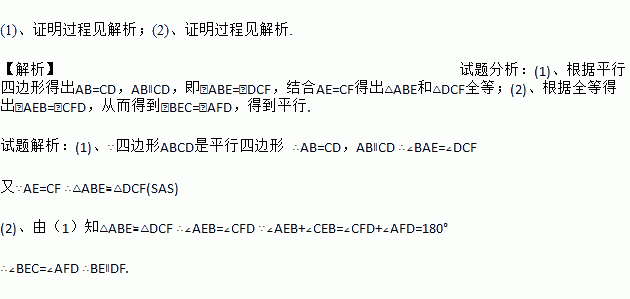 求证:(1)△ABE≌△CDF;(2)BE∥DF.
