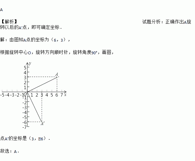 A 【解析】试题分析:正确作出A旋转以后的A′点,即可确定坐标. 【解析】 由图知A点的坐标为(6,3), 根据旋转中心O,旋转方向顺时针,旋转角度90°,画图, 点A′的坐标是(3,﹣6). 故选:A.