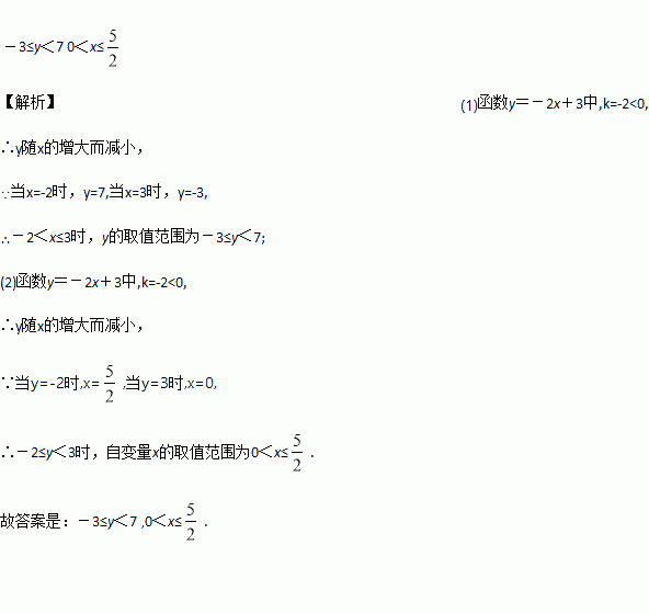 (1)已知函数y=-2x+3,则当-2<x≤3时,y的取值范围为________.