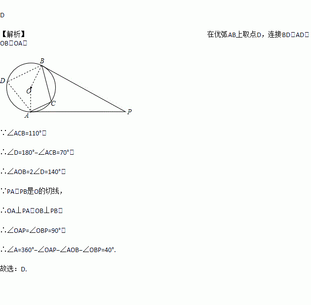 如图, 是⊙O的切线,A、B是切点,点C是劣弧上的一个动点,若=110°,则∠P的度数是( )