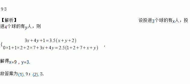 某班进行个人投篮比赛,受污损的下表记录了在规定时间内投进几个球的人数分布情况,已知进球3个或3个以上的人平均每人投进3.5个球,进球4个或4个以下的人平均每人投进2.5个球,则投进3个球的有____人,投进4个球的有___人.