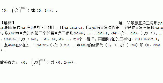 如图,在平面直角坐标系中,等腰直角三角形OA1A2的直角边OA1在y轴的正半轴上,且OA1=A1A2=1,以OA2为直角边作第二个等腰直角三角形OA2A3,以OA3为直角边作第三个等腰直角三角形OA3A4,…,依此规律,得到等腰直角三角形OA2017A2018,则点A2017的坐标为______.