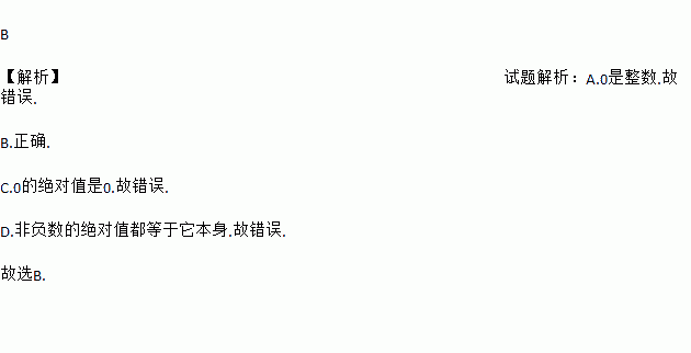 B 【解析】试题解析:A.0是整数.故错误. B.正确. C.0的绝对值是0.故错误. D.非负数的绝对值都等于它本身.故错误. 故选B.