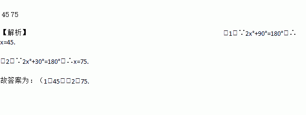 45 75 【解析】(1)∵2x°+90°=180°,∴x=45. (2)∵2x°+30°=180°,∴x=75. 故答案为:(1)45;(2)75.
