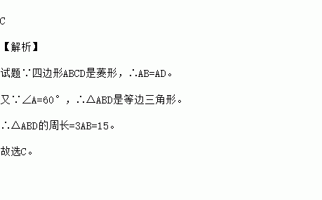 如图,在菱形ABCD中,已知∠A=60°,AB=5,则△ABD的周长是