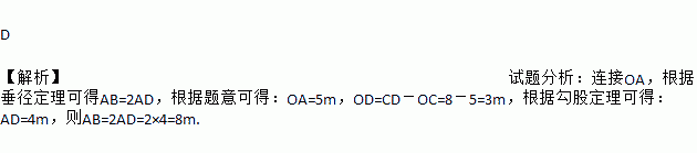 绍兴市著名的桥乡,如图,石拱桥的桥顶到水面的距离CD为8m,桥拱半径OC为5m,则水面宽AB为( )