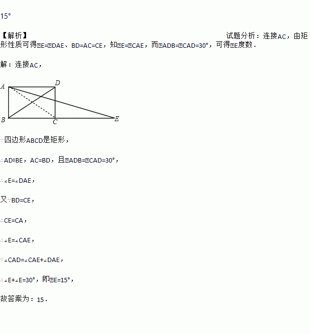 如图,延长矩形ABCD的边BC至点E,使CE=BD,连结AE,如果∠ADB=30°,求∠E的度数.