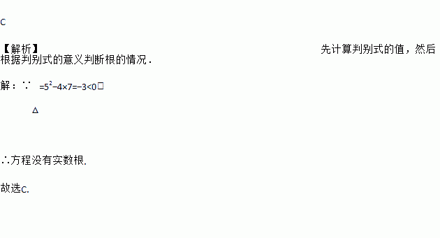 C 【解析】先计算判别式的值,然后根据判别式的意义判断根的情况. 【解析】 ∵△=52?4×7=?3<0, ∴方程没有实数根. 故选C.