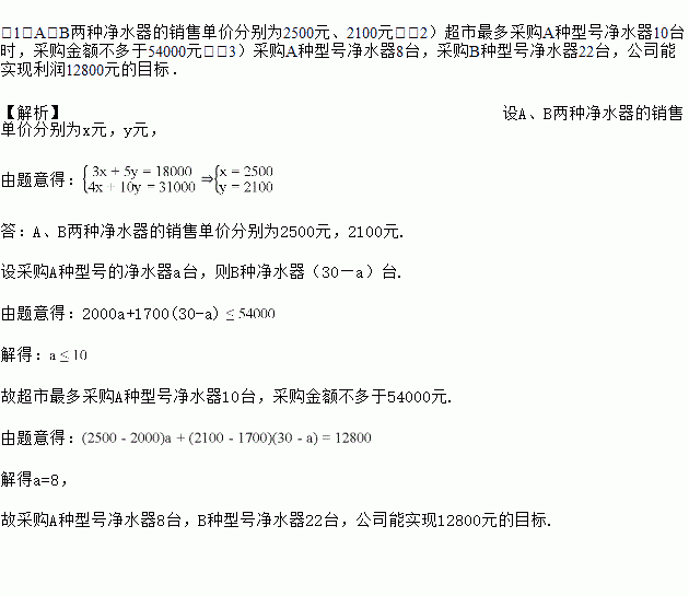(2)若电器公司准备用不多于54000元的金额在采购这两种型号的净水器共30台,求A种型号的净水器最多能采购多少台?