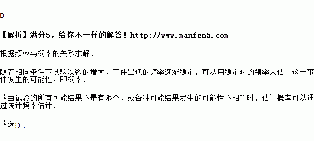 当试验的所有可能结果不是有限个,或各种可能结果发生的可能性不相等时,求(估计)概率可以( )