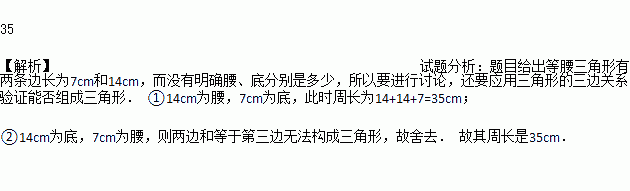 若等腰三角形的两条边长分别为7cm和14cm,则它的周长为__________cm.