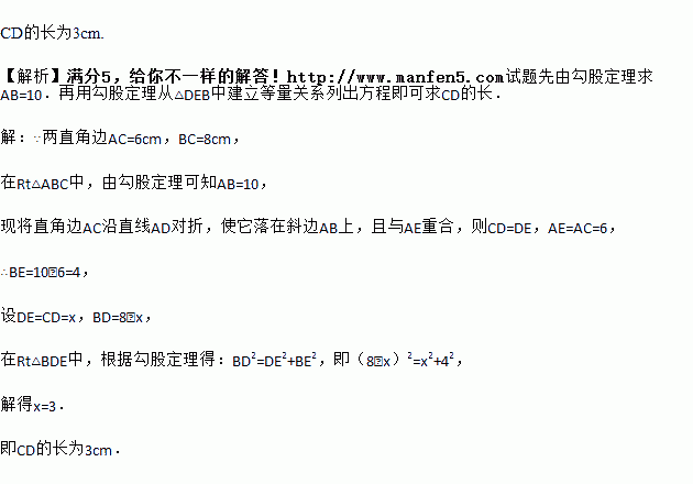 如图,有一个直角三角形纸片,两直角边AC=6cm,BC=8cm,现将直角边AC沿∠CAB的角平分线AD折叠,使它落在斜边AB上,且与AE重合,你能求出CD的长吗?