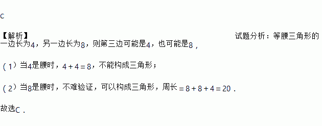 已知等腰三角形的一边长为4,另一边长为8,则它的周长是( ).