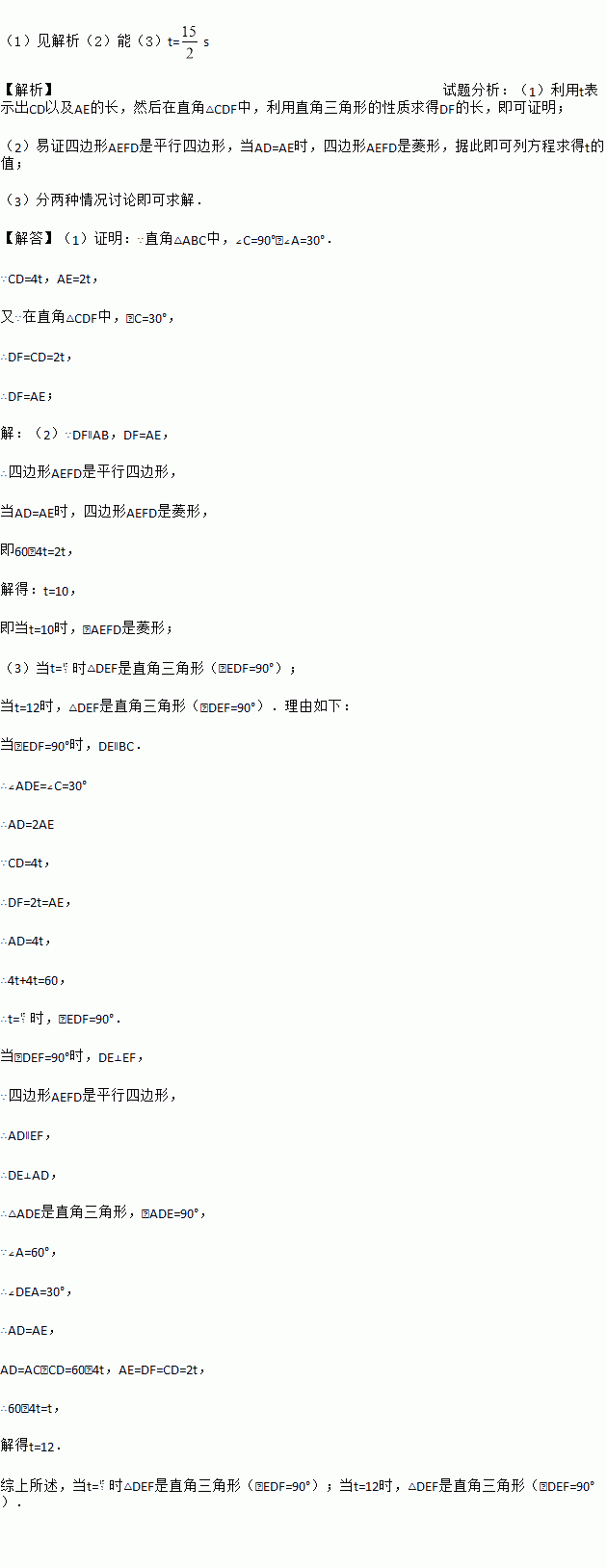 如图,在Rt△ABC中,∠B=90º,AC=60cm,∠A=60º,点D从点C出发沿CA方向以4cm/s的速度向点A匀速运动,同时点E从点A出发沿AB方向以2cm/s的速度向点B匀速运动,当其中一个点到达终点时,另一个点也随之停止运动.设点D、E运动的时间是
